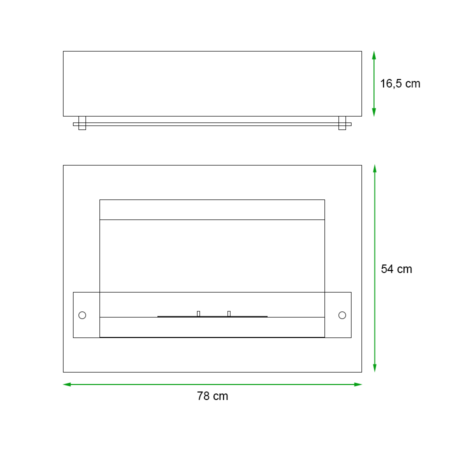 ScandiFlames Nebraska wall-mounted bio fireplace in black, measuring H: 54 cm, W: 78 cm, D: 16.5 cm. This elegant bioethanol fireplace has a burn time of up to 6 hours per fill and a heat output of 1.5 kW. The fireplace features safety glass on the front, protecting against drafts and wind, and providing a modern look. The black backplate enhances the depth and color of the flames. Includes mounting brackets, extinguishing tool, and requires no electricity. Easy to install and maintain, as it produces no smoke or soot.